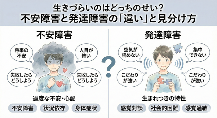 どちらも「不安」がベースにある病気ですが、不安の「襲ってき方」が違います。