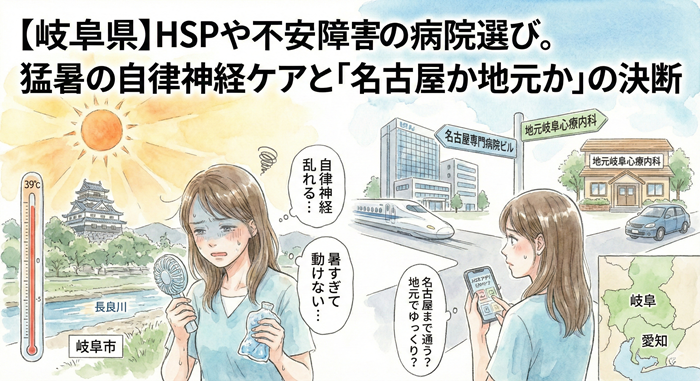 今日は、岐阜県のHSPさんが、猛暑や通勤ストレスに負けず、自分の心を守るための場所(心療内科)を見つけるためのヒントと、エリア別の事情についてお話しします。