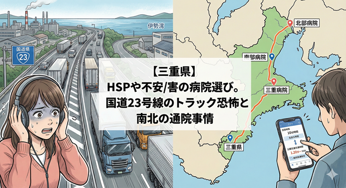 今日は、三重県のHSPさんが、トラックの恐怖や移動の不便さに負けず、自分の心を守るための場所(心療内科)を見つけるためのヒントと、エリア別の事情について、じっくりとお話しします。