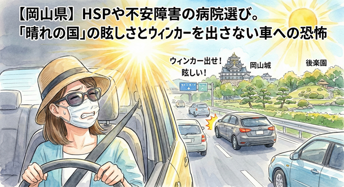 今日は、岡山県のHSPさんが、眩しすぎる光や危険な道路事情に負けず、自分の心を守るための場所(心療内科)を見つけるためのヒントと、エリア別の事情について、じっくりとお話しします。